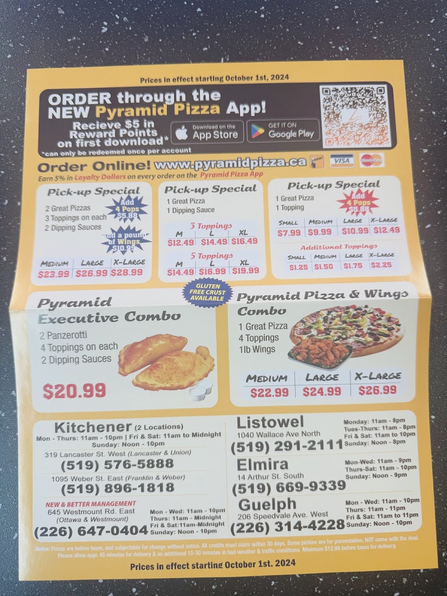 Welcome to Pyramid Pizza & Wings, a hidden gem located at 140 Wallace Ave N, Listowel. This delightful pizza restaurant is renowned for its scrumptious pizza and flavorful wings that keep locals coming back for more. The menu features mouthwatering offerings, including a variety of pizzas generously topped to perfection and wings that are massive, juicy, and lightly crispy. Side orders like garlic bread and mozzarella sticks complement your meal beautifully.