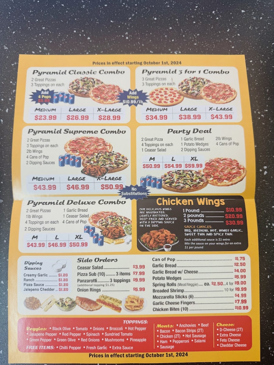 Customer reviews consistently highlight the exceptional service, quick online ordering, and remarkable value. Guests rave about the inviting atmosphere, noting the clean and friendly environment that enhances the dining experience. Whether you're craving a classic pizza or feeling adventurous with their seasonal specials, such as their Halloween-themed creations, Pyramid Pizza & Wings delivers delicious satisfaction. Venture in for a slice, and let your taste buds embark on a flavorful journey that evokes nostalgia and pure joy!